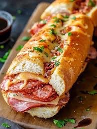 ساندویچ سالامی و موزارلای گریل شده با نان باگت٬ سس مخصوص٬ خیارشور٬ گوجه و کاهو
